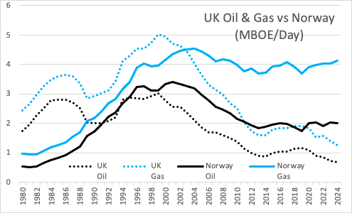 Thanks mostly to the 'windfall tax' imposed in 2022, UK tax receipts from oil and gas amount to £25 billion for the whole of the last 10 years. That's about £300 per UK citizen. In contrast, with its tiny population, each Norwegian has a $360,000 stake in the sovereign wealth fund, now valued at over $1,800 billion. This is because a much bigger share of the profits end up in government coffers. Producers in UK waters paid virtually nothing to government from 2016 for the oil & gas they extracted from UK waters and sold at record profit, until the windfall tax helped claw something back as UK tax payers suffered record bills for their energy.